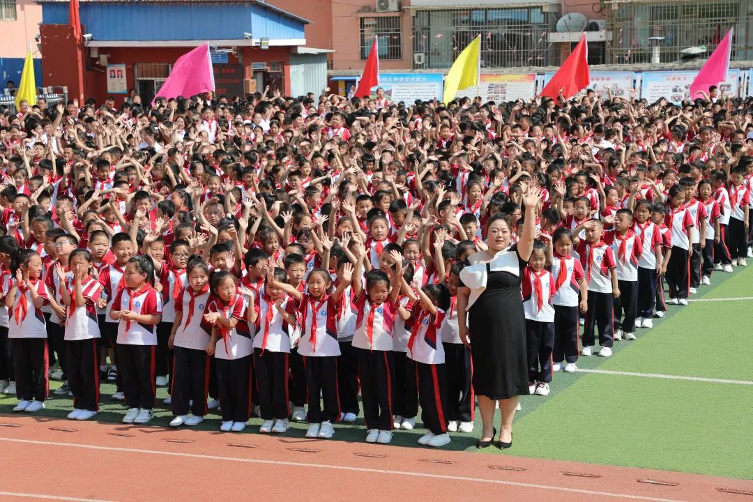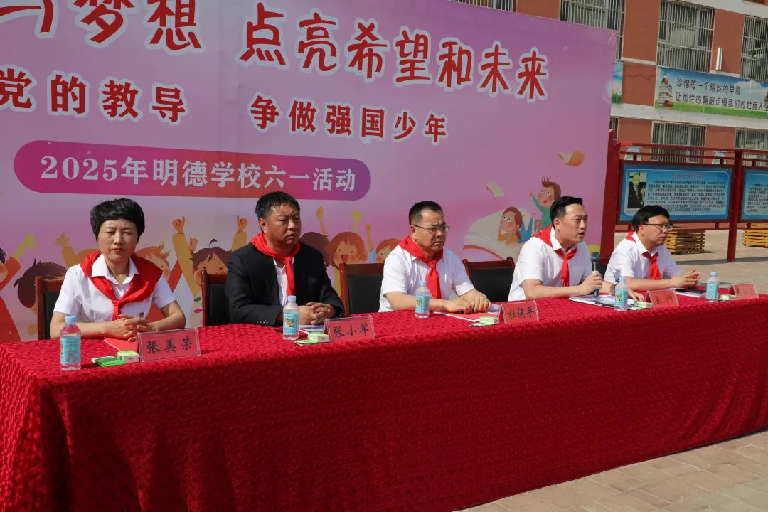 在南城区明德小学,县委书记杜侯平,县委常委、政府副县长张帅与全体师生齐聚一堂,共同庆祝孩子们的节日。庆祝活动中,军乐队率先登场,激昂的乐声瞬间点燃现场气氛。紧接着,非洲鼓社团带来精彩的《凉州词》展演,铿锵有力的鼓点配合孩子们专注的表演,赢得阵阵掌声。少先队员们为与会领导敬献红领巾,鲜艳的红领巾飘扬在胸前,传递着孩子们的敬意。升国旗环节,全体人员庄严肃立,奏唱国歌,行注目礼,表达对祖国的无限热爱。