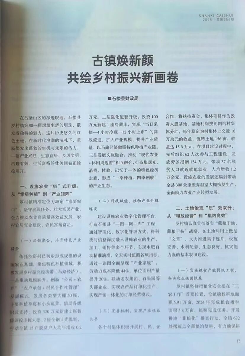 《山西财税》2025年第6期,以《古镇焕新颜 共绘乡村振兴新画卷》为题,报道我县罗村镇从设施农业、土地治理、人才振兴、生态管护、农文旅融合多方面发力,推进乡村振兴的生动实践。