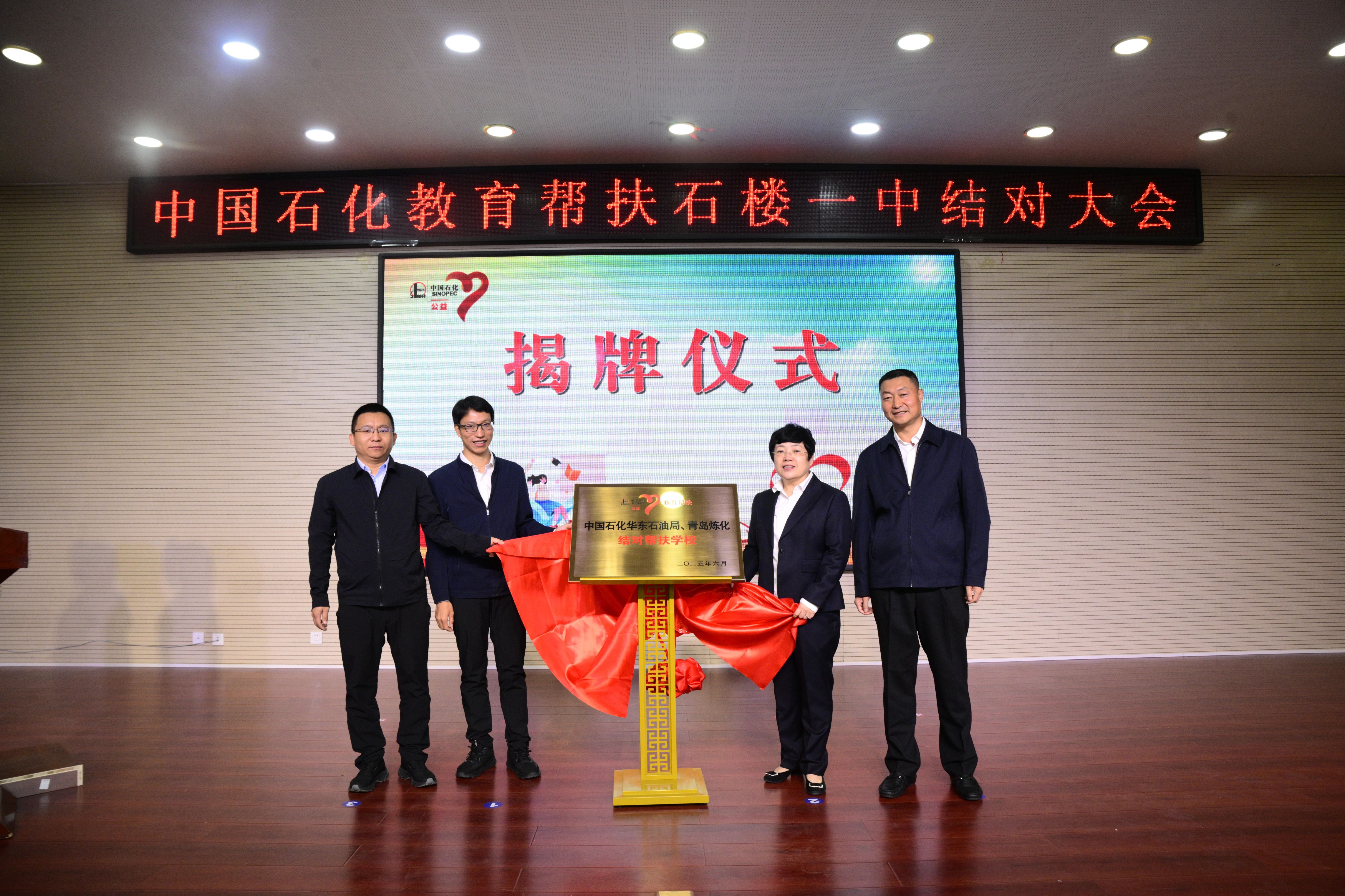 签约仪式现场,团中央青年发展部有关负责同志,中国石化华东石油局、中国石化青岛炼化公司负责人,石楼县政府负责同志在石楼一中共同为帮扶项目揭牌,中国石化华东石油局、青岛炼化公司共向石楼一中捐赠帮扶资金40万元,并向在校生捐赠书包、图书等学习用品价值15万元。