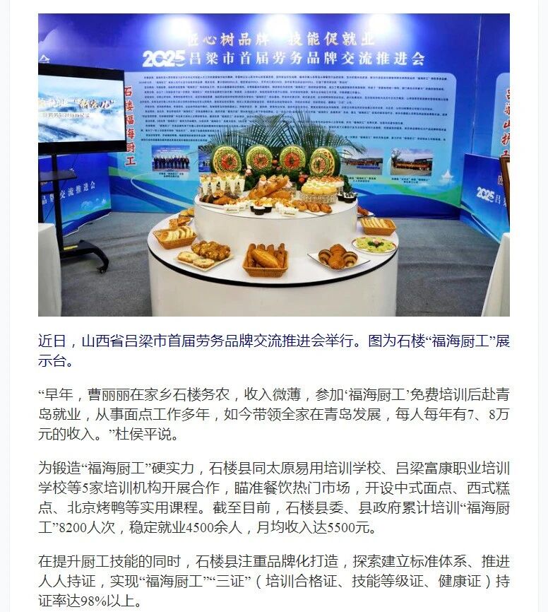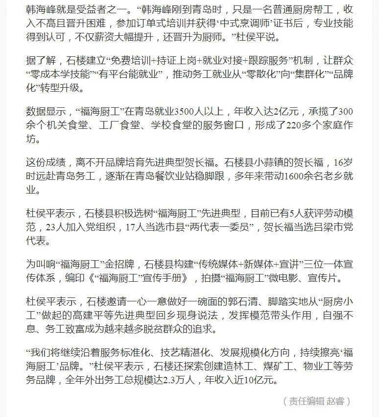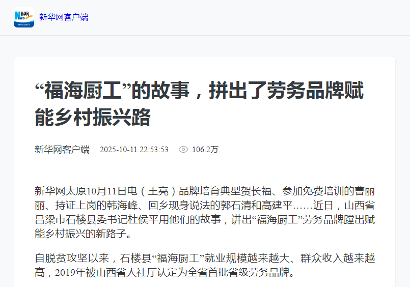 10月11日,新华网客户端以《“福海厨工”的故事,拼出了劳务品牌赋能乡村振兴路》为题,报道我县通过“福海厨工”劳务品牌蹚出赋能乡村振兴新路子的事迹。