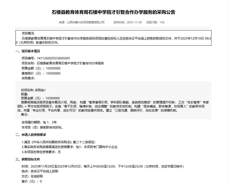 石楼县教育体育局石楼中学招才引智合作办学服务的采购公告