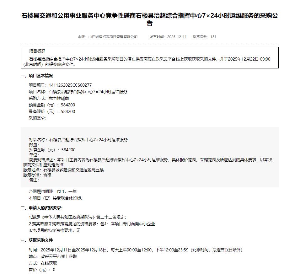石楼县交通和公用事业服务中心竞争性磋商石楼县治超综合指挥中心7×24小时运维服务的采购公告