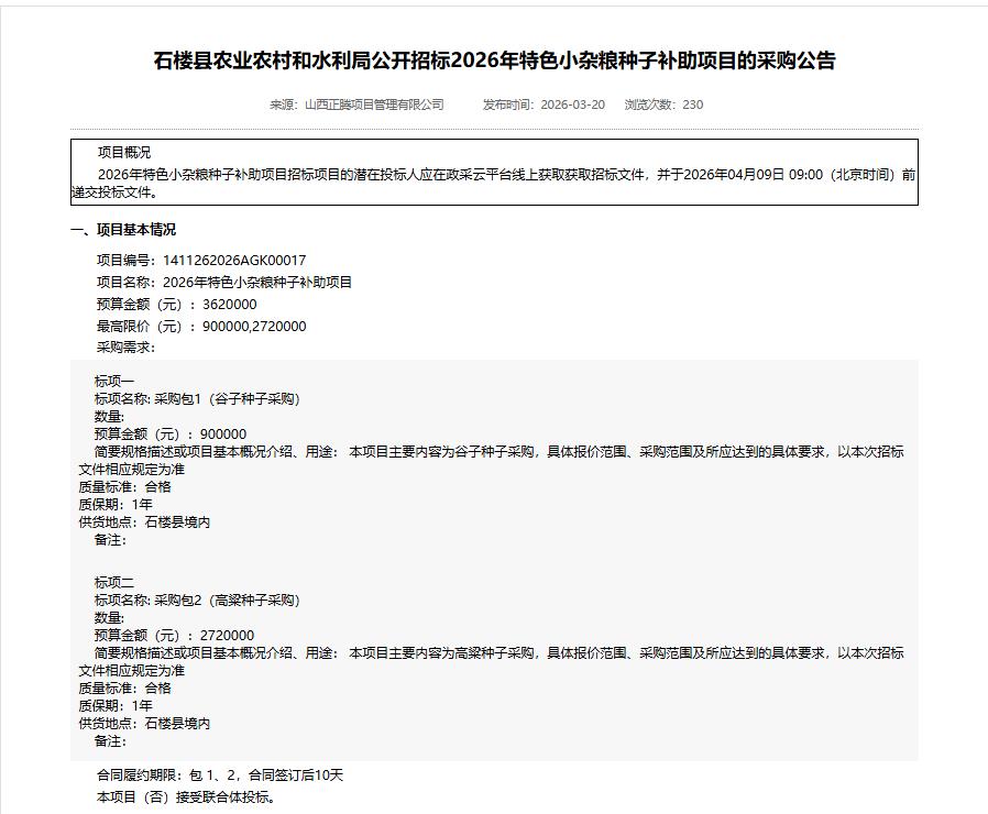 石楼县农业农村和水利局公开招标2026年特色小杂粮种子补助项目的采购公告