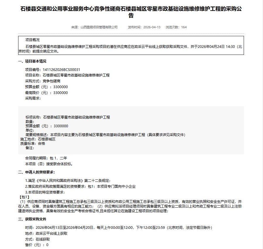 石楼县交通和公用事业服务中心竞争性磋商石楼县城区零星市政基础设施维修维护工程的采购公告