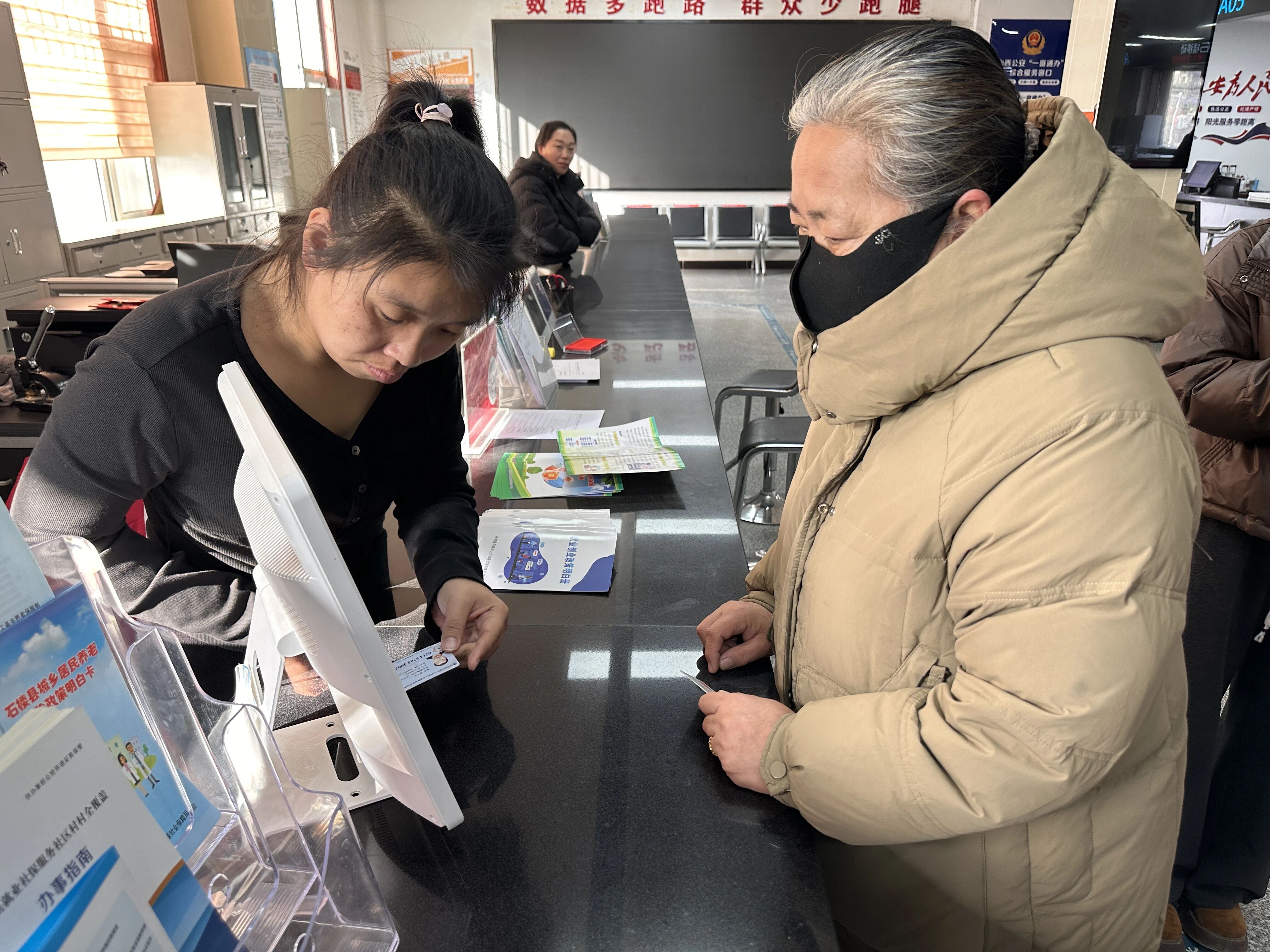 近日,石楼县人社部门积极落实省、市、县关于“高效办成一件事”工作部署,全面提升人社服务规范化、便利化水平,在政务大厅人社服务窗口开通参保登记、缴费查询、到龄补缴、资格认证和社保卡办理等高频服务事项,以实现群众办事“就近办”“一次办”。