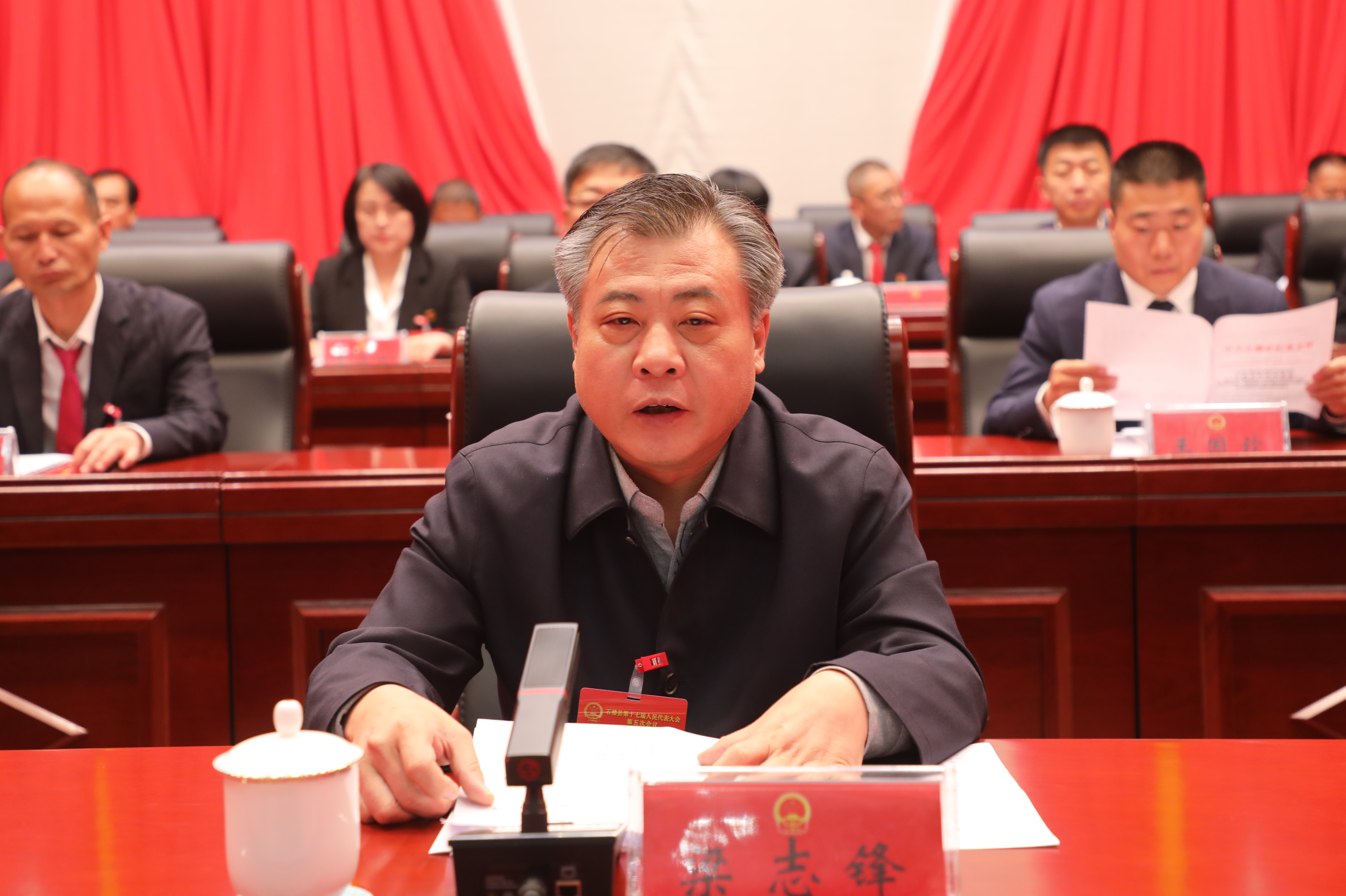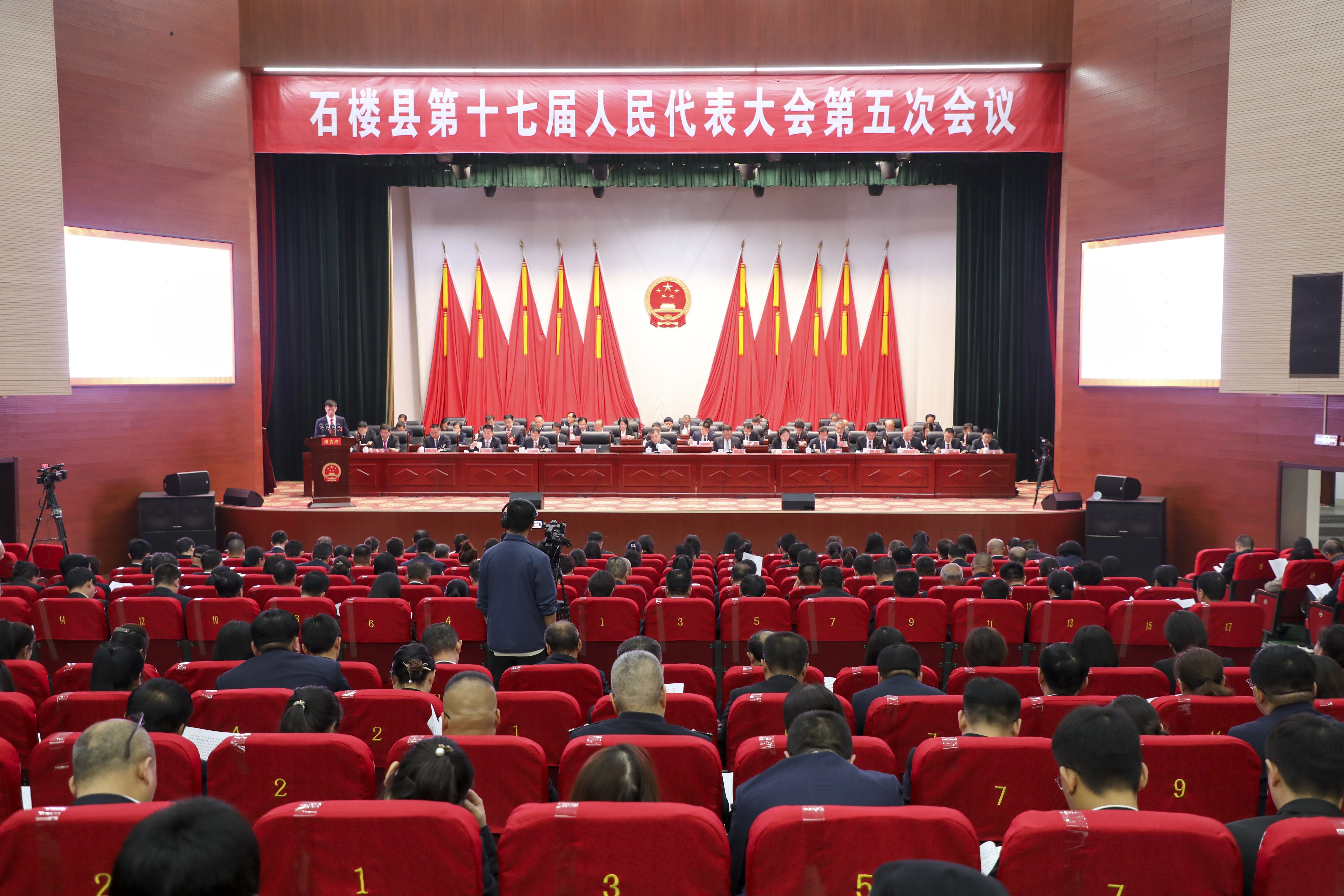 会场布置简朴、气氛热烈。主席台帷幕中央,十面鲜艳的红旗簇拥着庄严的国徽。二楼眺台上,悬挂着“改革创新 拼搏奋进 不辱使命 不负重托 为谱写中国式现代化石楼篇章而团结奋斗”的标语,鼓舞人心,催人奋进。