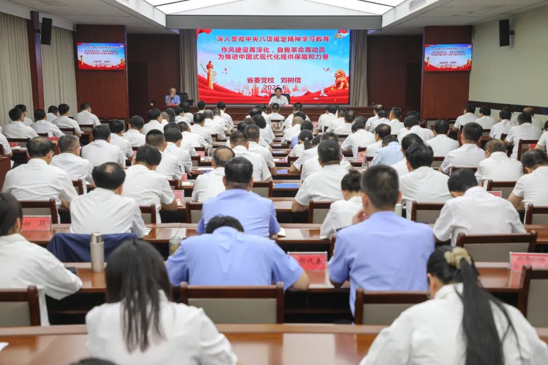 讲座邀请山西省委党校、山西行政学院刘树信教授进行专题辅导。刘树信教授带领全体党员领导干部重温了八项规定的主要内容,详细讲述了常抓不懈学习教育的现实意义,解析了违反中央八项规定精神的主要表现及党纪处分依据,阐述了把贯彻中央八项规定精神融入党的自我革命实践的内在要求。