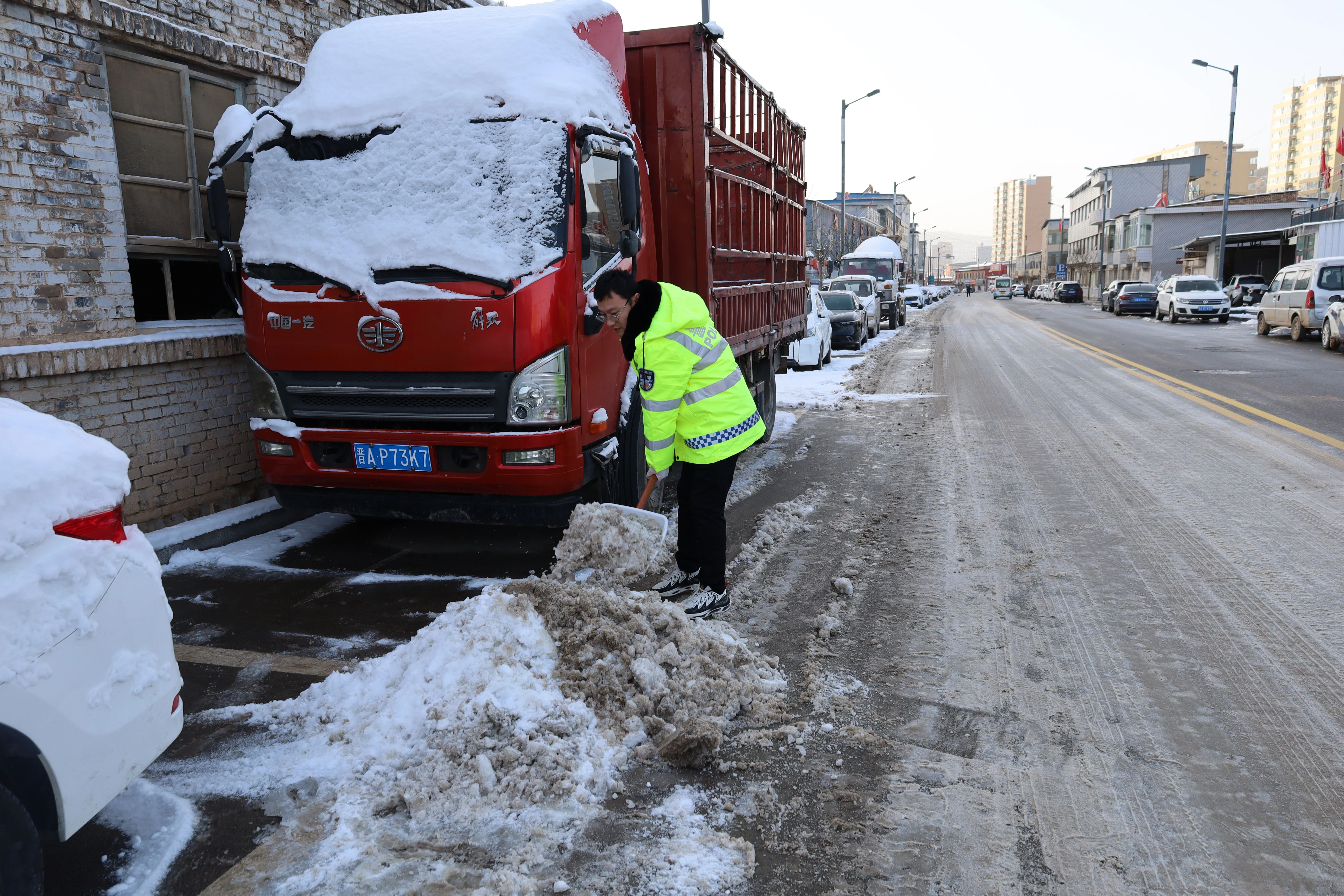 降雪伊始,大队民辅警便迅速奔赴城区各主要路口、学校周边、城乡结合部及山区易滑路段等交通关键节点,顶风雪、战严寒,全力投入交通疏导和清雪除冰工作。在结冰路段,民辅警采取定点疏导与流动巡逻相结合的方式,指挥过往车辆减速慢行、保持安全车距,有序通过危险路段,有效避免了交通拥堵和事故发生;针对部分车辆因路面湿滑出现打滑、熄火等问题,民辅警主动上前推车助力,耐心指导驾驶员谨慎操作,用暖心行动解决群众出行难题,以实际行动践行“人民公安为人民”的庄严承诺。