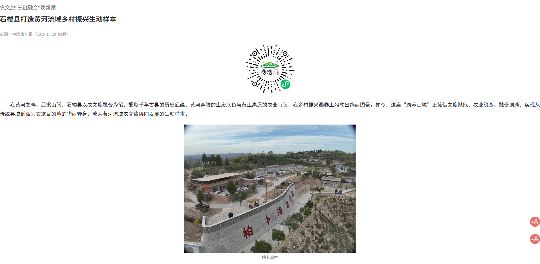 10月20日,《中国青年报》第八版以《石楼县打造黄河流域乡村振兴生动样本》为题,报道我县以农文旅融合为核心,通过文旅激活乡村、“奇湾”品牌升级特产、“三色文化”深化融合,打造黄河流域乡村振兴样本的事迹。