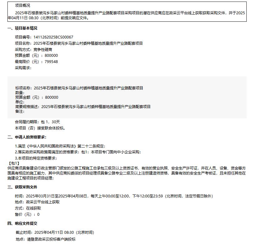 2025年石楼县裴沟乡马家山村委种植基地质量提升产业路配套项目的采购公告