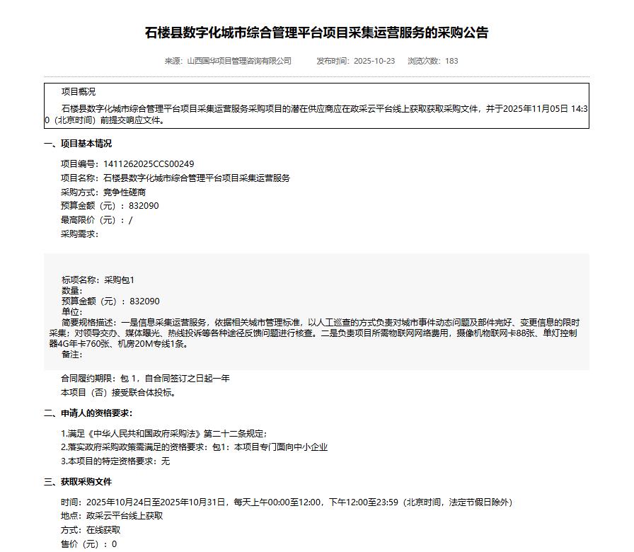 石楼县数字化城市综合管理平台项目采集运营服务的采购公告