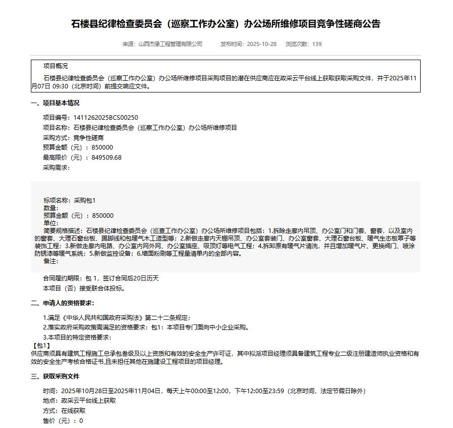 石楼县纪律检查委员会(巡察工作办公室)办公场所维修项目竞争性磋商公告