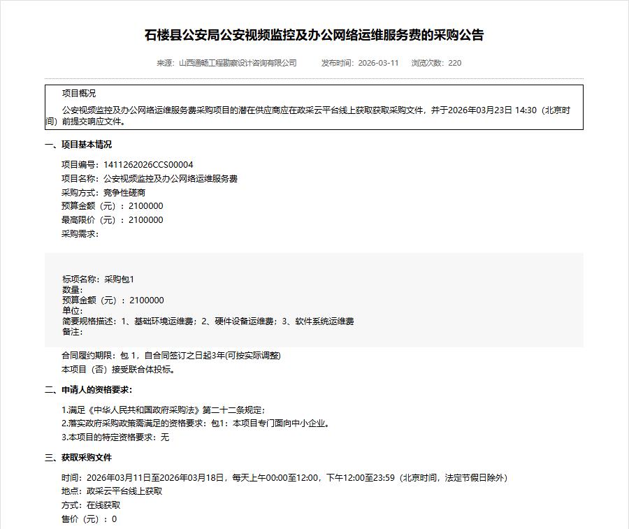 石楼县公安局公安视频监控及办公网络运维服务费的采购公告