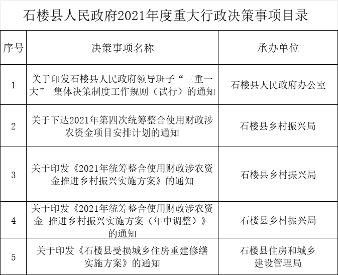 石楼县人民政府2021年度重大行政决策事项目录