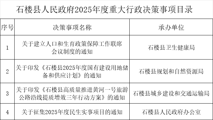 石楼县人民政府2025年度重大行政决策事项目录