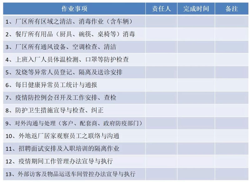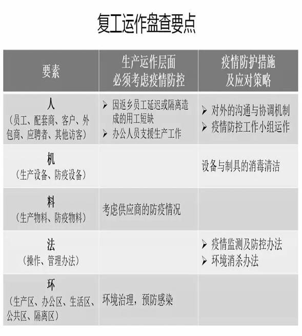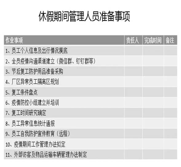 通过以上七点对复工时间,复工前的准备,各级管理人员复工前的工作事项安排等,企业和员工在满足防控要求的前提下可正常复工复产。