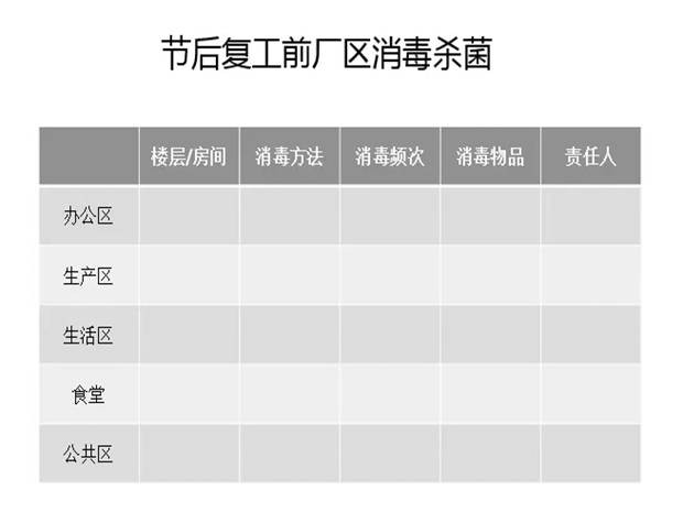 复工前工厂各个区域都必须进行消毒,杀菌处理,确保工厂内部人员的防护安全,特别注意食堂就餐、早会、例会等人员聚集时。