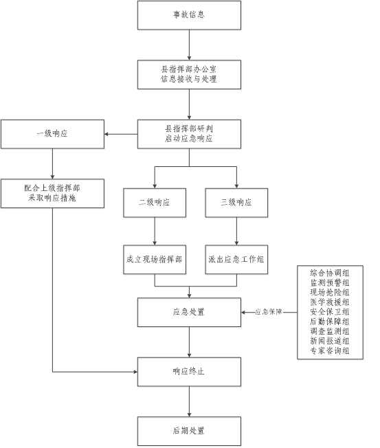 县指挥部下设9个应急工作组:综合协调组、监测预警组、现场抢险组、医学救援组、安全保卫组、后勤保障组、调查监测组、新闻报道组、专家咨询组。