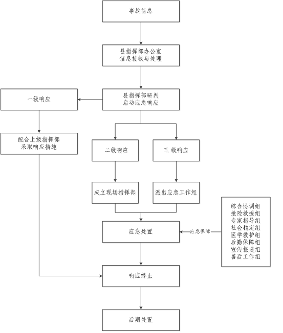 响应结束程序:三级响应由县指挥部办公室主任宣布应急响应结束,二级响应由县指挥部指挥长宣布应急响应结束,一级响应由县应急救援总指挥部总指挥宣布应急响应结束。