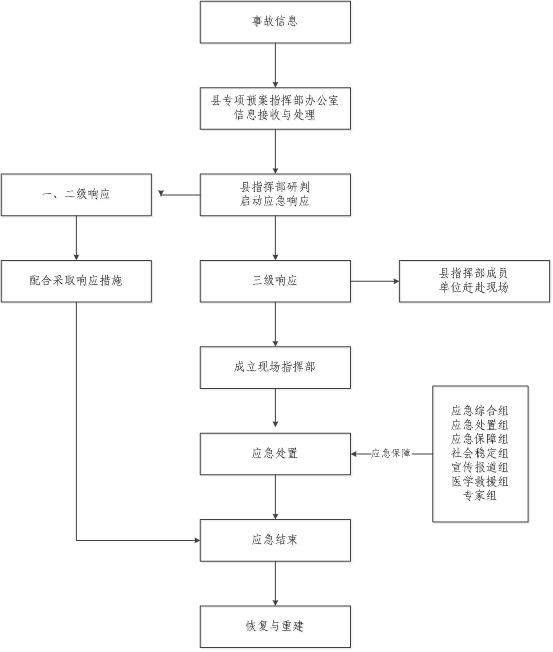 响应结束程序:三级响应由县指挥部指挥长宣布应急响应结束,二级、一级响应由县应急救援总指挥部总指挥宣布应急响应结束。