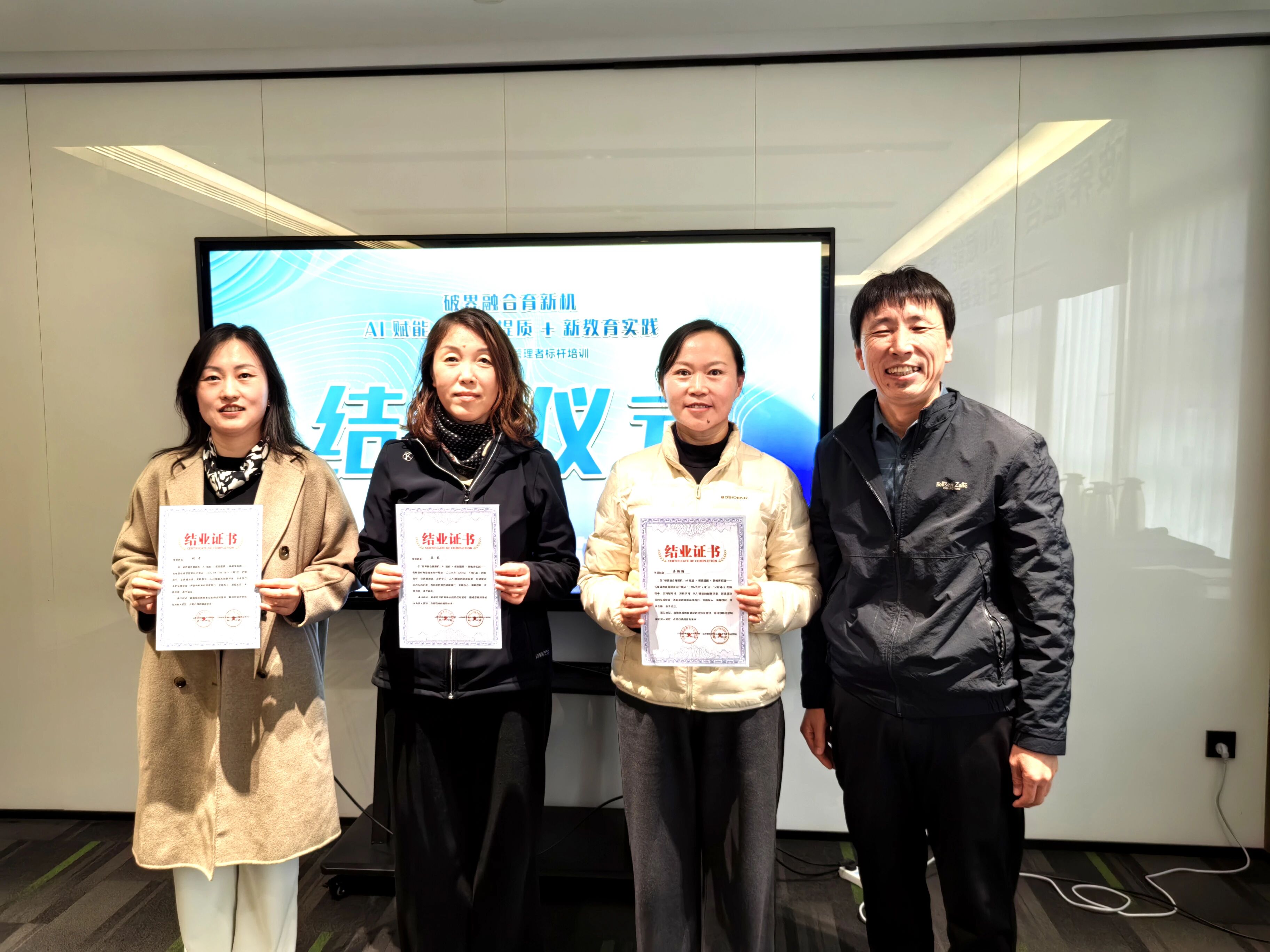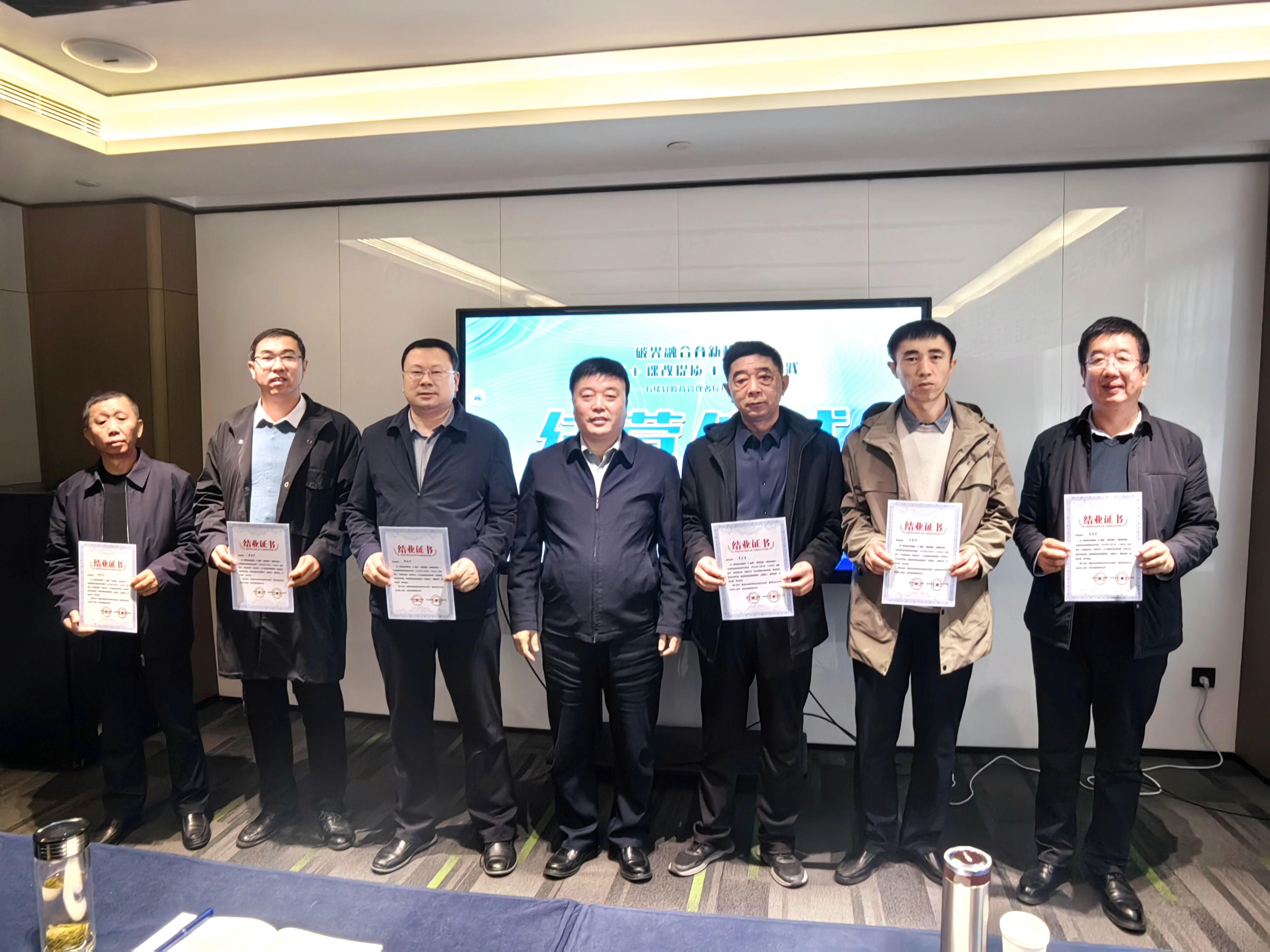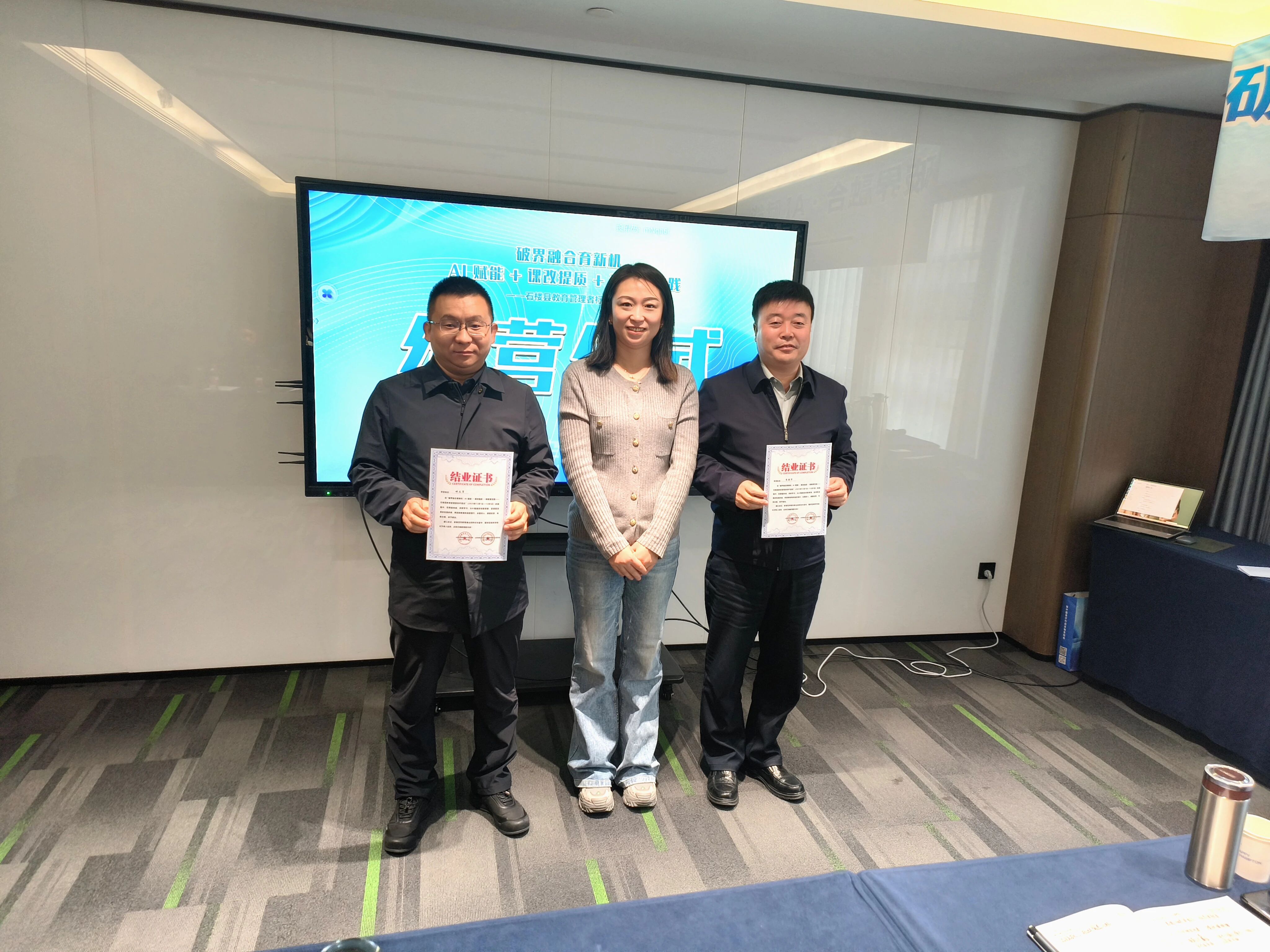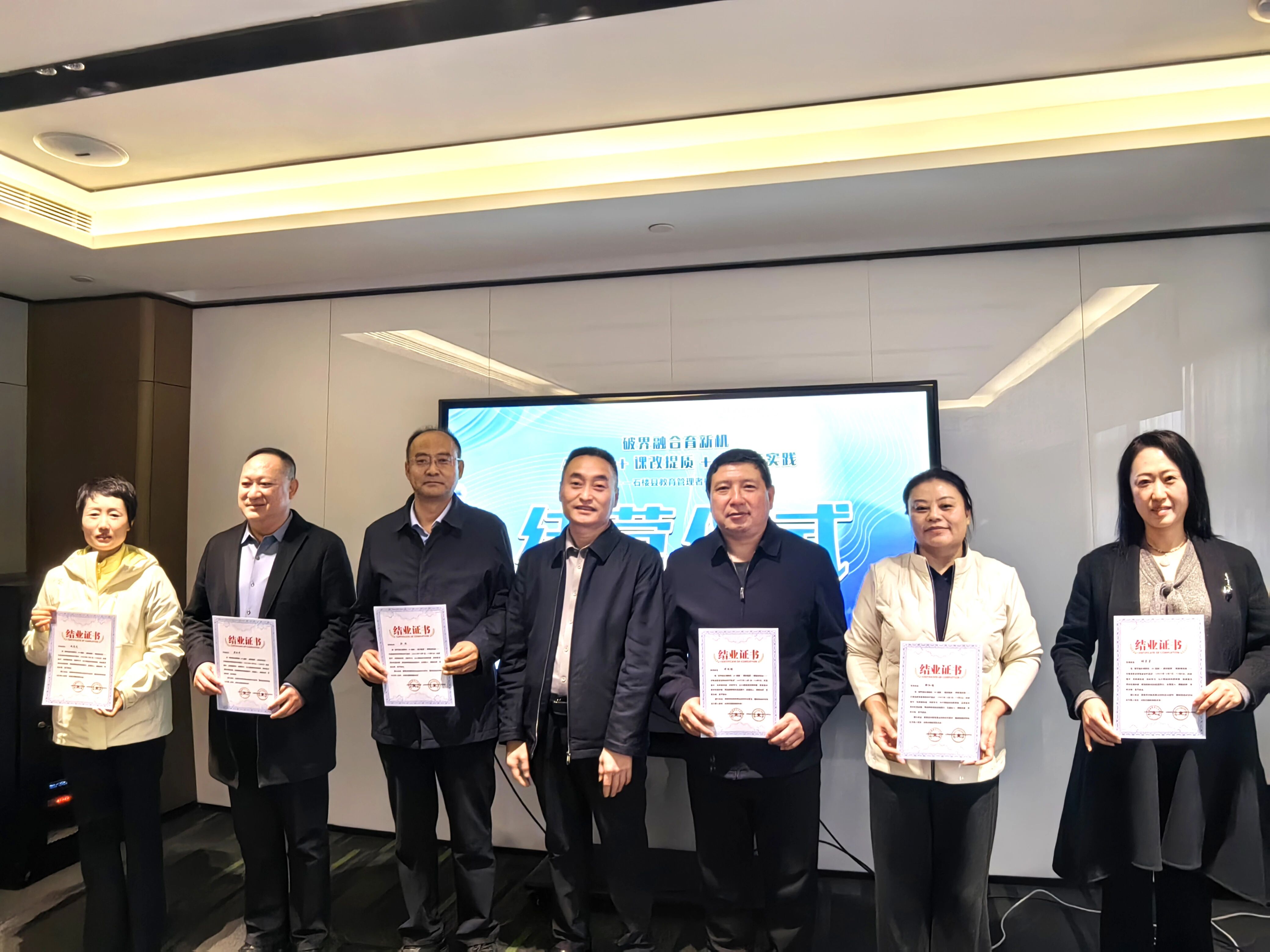 在结业复盘暨结营仪式上,团队进一步凝聚战略共识。县教体局负责人锚定石楼教育高质量发展的四大关键抓手:学段衔接科学化、师资培育精准化、平台应用差异化、改革推进长效化,擘画五年课改规划。呼文军立足县域全局,用“思想上重视,观念上改变”“行动要迅速,措施要明确”“改革要全面,底线要收好”三句话锚定改革方向,强调要以新教育“行动就有收获,坚持就有奇迹”的信念与“功成不必在我,功成必定有我”的担当,力争3至5年建成可复制、可推广的山西课改样板,让优质教育成为石楼县域竞争力的核心支撑。结营仪式上,温情的回顾影片重现研修点滴,呼文军与县教体局负责人共同为参训者颁发结业证书,这份沉甸甸的证书既是研修成果的见证,更是未来履职的责任嘱托。